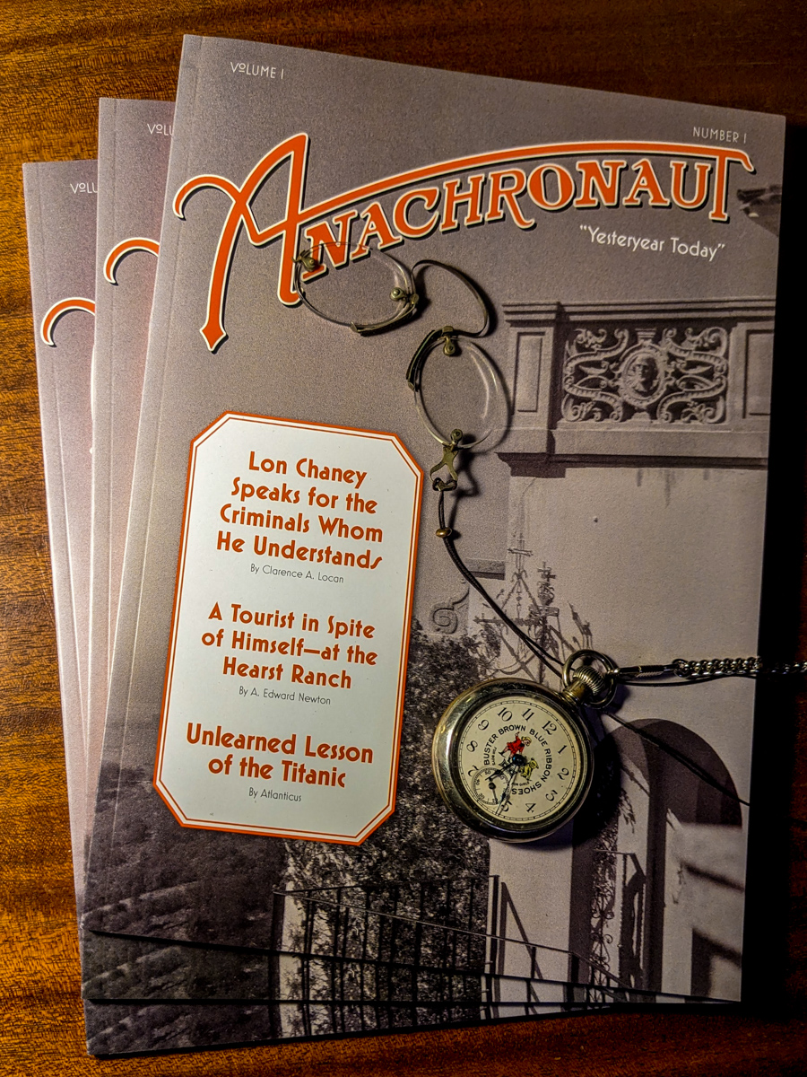 The Anachronaut is a time traveler's monthly, and this masthead was created to evoke typography of the 1930s. The magazine is dedicated to reprinting articles from the past about just about any topic so as to serve potential time travelers who wish not to appear out of place when visiting the past. One would not like to stand out in a crowd because they didn't know about the latest Lon Chaney film.