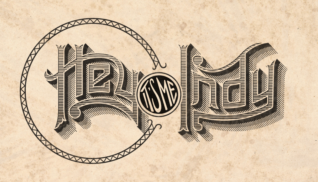 This is an update to my 2018 "engraving" that served alongside my old 2016 1880s monogram, in fact, it's on the reverse side of my business card. It even uses the same circular frame from my monogram. Inspired by the letterforms on old engraved business letterheads, it's a sort of juxtaposition between such over-the-top lettering and such a casual greeting from me, Indy. Hey. It's me.