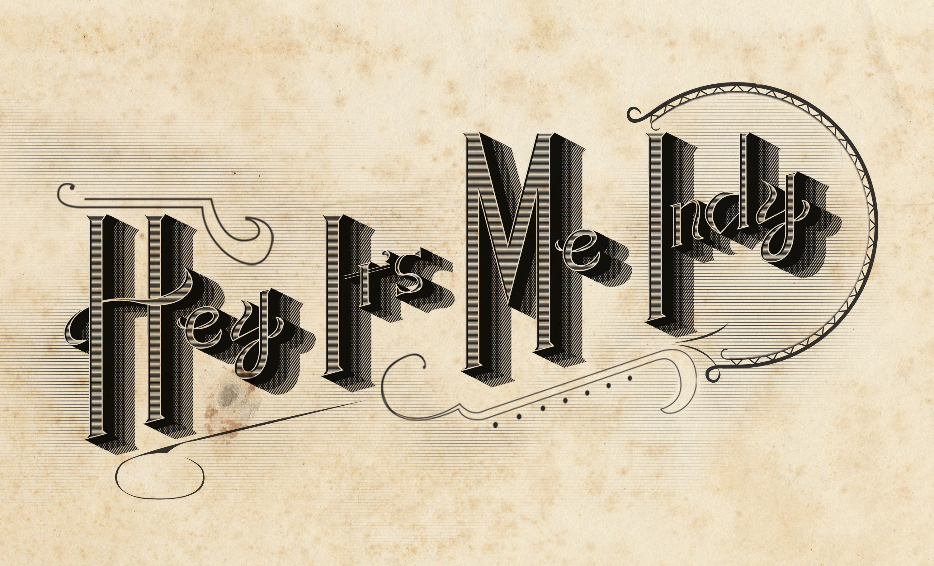 This one was done One Million Years ago and has long since served as a sort of secondary logo to my 1880s I.P. logo, in fact, it's on the reverse side of my business card. Inspired by the letterforms on old postcards and engraved business letterheads, I combined he two to make this. A sort of juxtoposition between such over-the-top lettering and such a casual greeting from me, Indy. Hey. It's me.