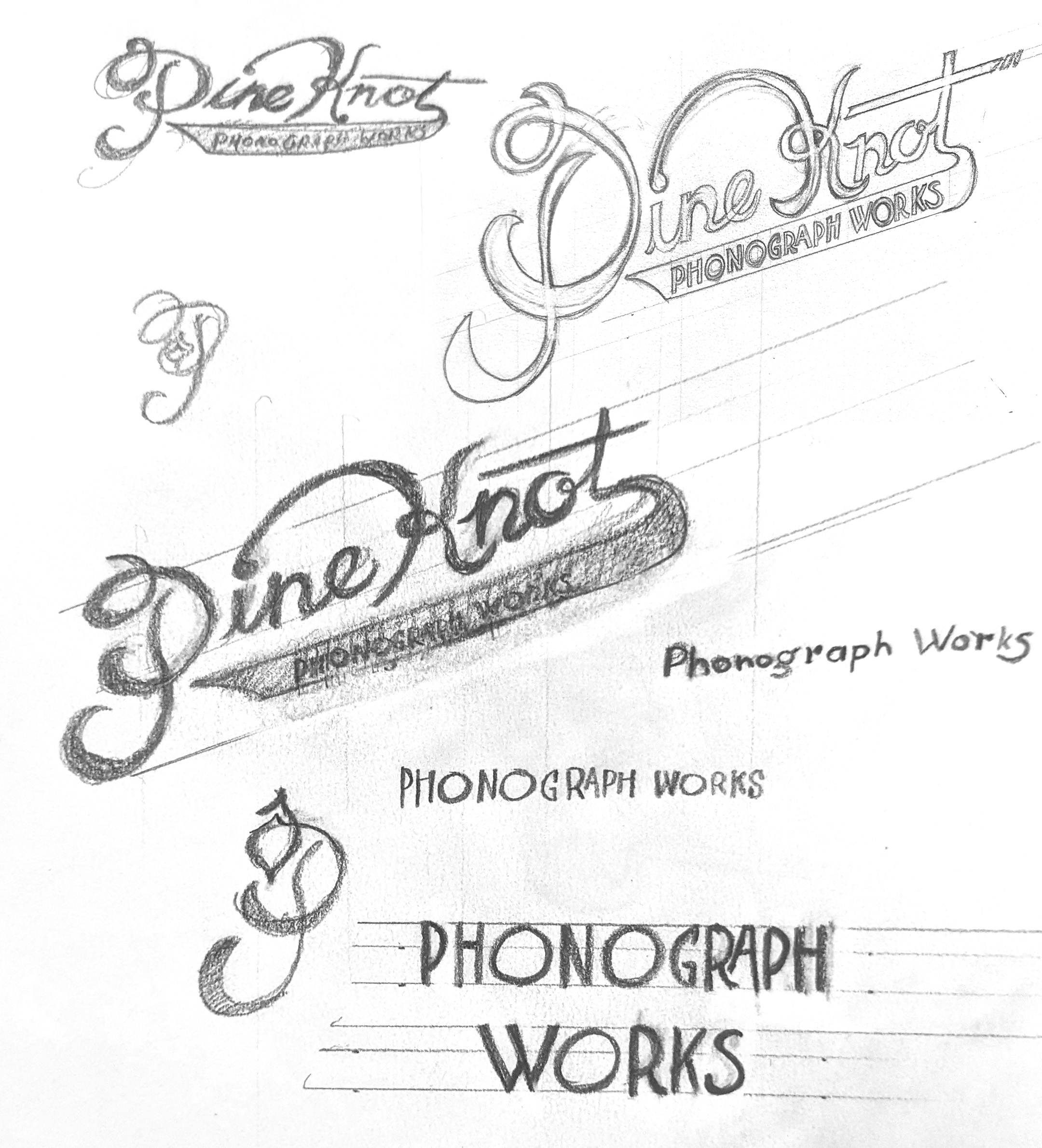 The Pine Knot Phonograph Works logo is based on the typography if 1920s advertisements and phonograph related logo design. "Phonograph Works" is based on the type used on department headers in Talking Machine World, a phonograph trade journal, while "Pine Knot" was based a little on my handwriting and exaggerated to look like calligraphy.