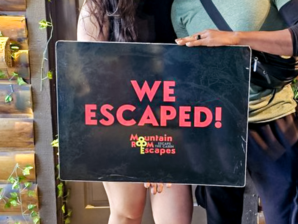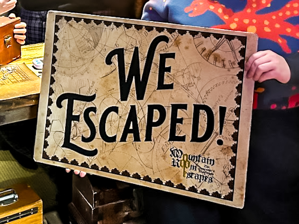 Sign for Mountain Room Escapes' escape room emporium, a store within the business that sells puzzles, games, and other escape room-related products.